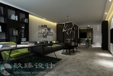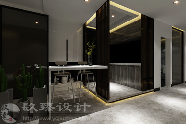 墻壁上的赫本或是工作室內的一抹春風,案幾靠幾根細細的桌腿支撐,頗有潑墨揮毫之雄壯,這簡單的造型包含著善意和平和。室內一角小小吧臺可在閑暇之余略飲薄酒,疏影疊山,且飲且談。設計師用現(xiàn)代設計手法解釋了傳統(tǒng),使環(huán)境和心靈都達到靈與靜的唯美境界。