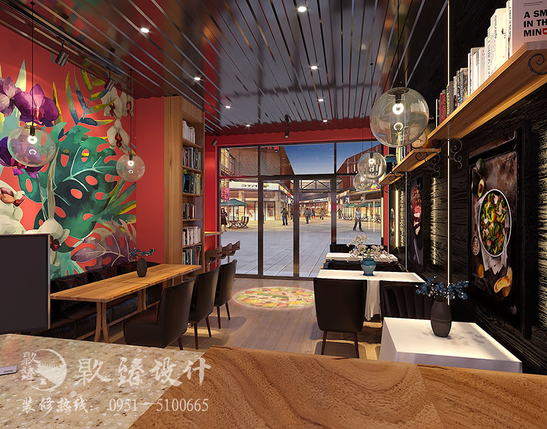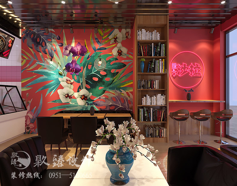的成分在里面,大概是銀川裝修公司|镹臻設(shè)計|甜品店裝修設(shè)計|設(shè)計師想讓來這里就餐的顧客們在這種浪漫,多彩的環(huán)境下會更加開心吧。你們看到墻面的彩繪造型了嗎?這也是本案例中很大的亮點,藝術(shù)與色彩的碰撞摩擦出了不一樣的火花,恰好中間設(shè)計了書架隔斷,又分化出另一個區(qū)域,加上了店鋪logo,不會顯得那么雜亂無章,也許這樣的設(shè)計,就是華而不亂的體現(xiàn)吧。