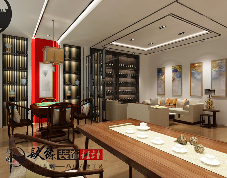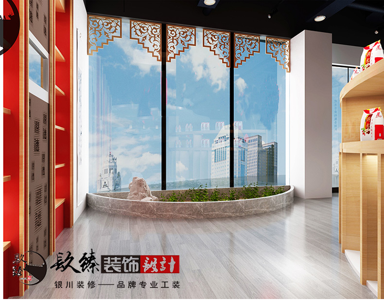 整個空間分為展示廳,休閑廳,辦公廳,每一個空間的主題色都有所不一。風(fēng)格為新中式風(fēng),銀川裝修公司|镹臻裝飾|店鋪裝修新中式風(fēng)格的設(shè)計中我們經(jīng)常能看到的是木質(zhì)線條吊頂,中式風(fēng)格的造型吊燈。