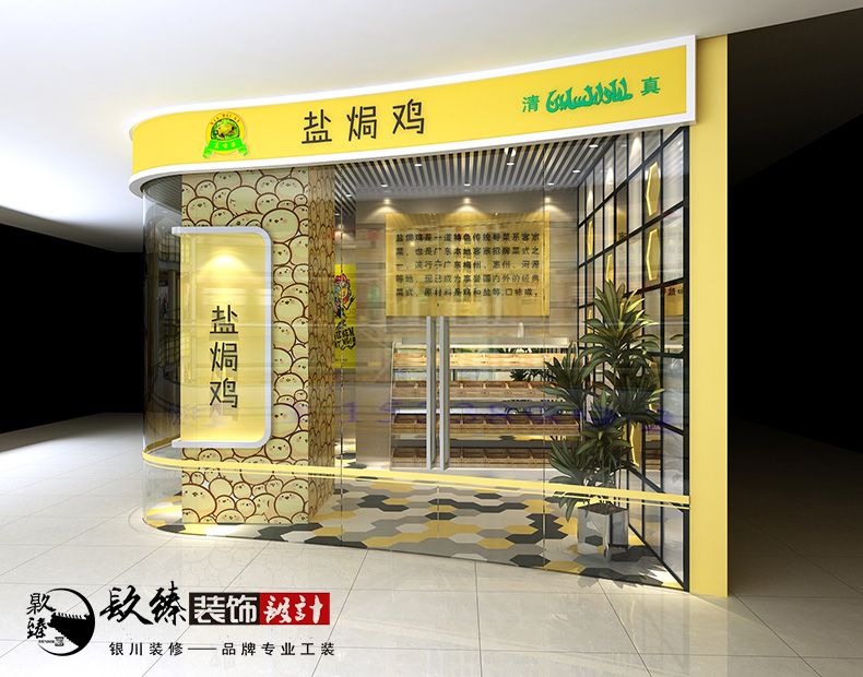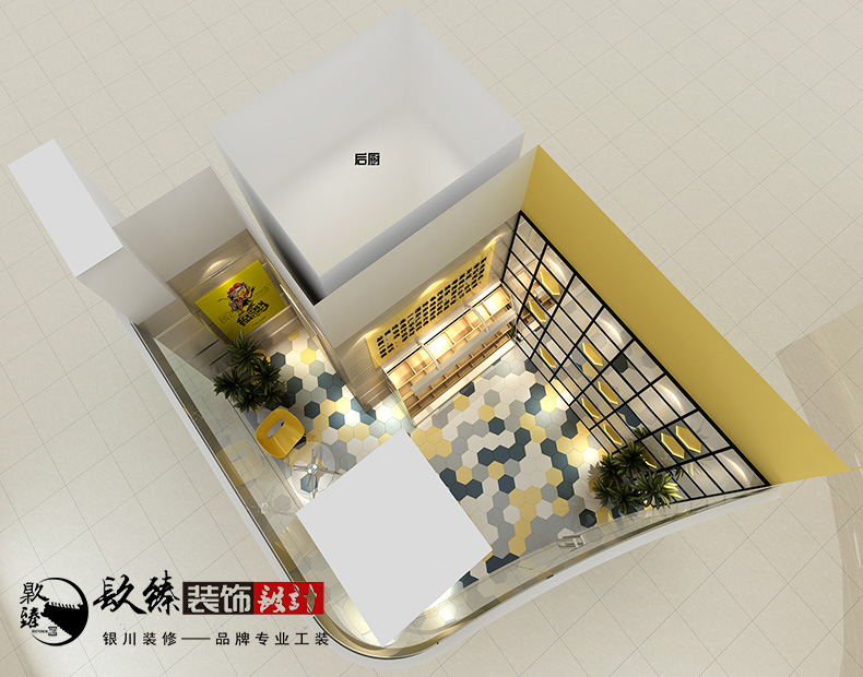 快銷餐飲食品店的裝修設(shè)計上,要注意色彩的運用,銀川餐飲裝修設(shè)計|镹臻裝飾|銀川裝飾公司設(shè)計師在前期對色彩的定位上以亮色為主,因為面積不大,所以靚麗的色彩會比較突出,亮黃色更顯眼一些,同時也是暖色調(diào),這樣可以增加顧客進(jìn)店消費的幾率。地面的造型也是和墻面的多邊形互相映襯。