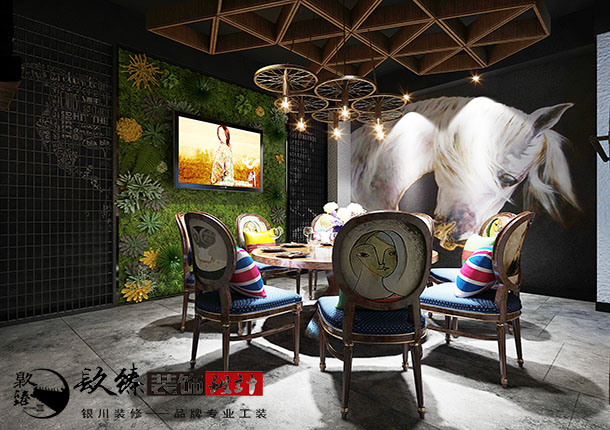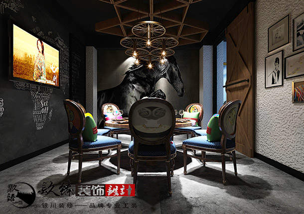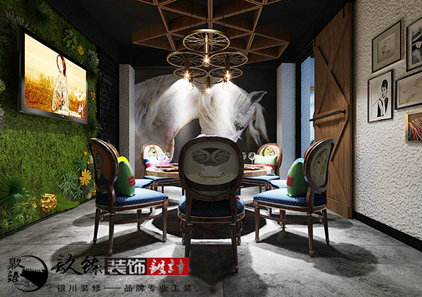 包房的設(shè)計中較為私密的空間,因干凈、不被打擾,表現(xiàn)出一定的安全感。其一,具有鮮明地方文化傳統(tǒng)的特點,使顧客產(chǎn)生新鮮感;其二,與家一樣符合生活習慣,親切,包間內(nèi)適合的燈光能讓菜品更具誘惑力,增加菜肴亮點并起到增加食欲。一幅生動的壁畫,配以室內(nèi)木質(zhì)墻面裝飾,吊頂部分使用木質(zhì)車輪造型作為裝飾,更與自然相互結(jié)合,電視墻的設(shè)計使用人造花朵和人造草坪搭配,如同草原一樣,突出了該餐廳的主題特色。包間整體內(nèi)使用黑白色系,裝飾上使用亮色系的桌椅進行中和效果,加上燈光的照射下,使空間的的色彩感十分的柔和。所有的元素搭配都貼近人文與自然,聽接近蒙古特色,這也是本案設(shè)計最終要表達的主題,蒙餐文化是游牧民族的智慧和文化沉淀的表現(xiàn),在飲食文化中,蘊藏著他們的歷史傳統(tǒng),也滲透著游牧文化的精髓,同時也體現(xiàn)著蒙古族人民對自然的崇尚和對自由的向往,追求人與自然的融合。