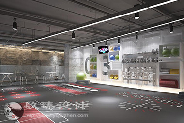 根據(jù)客戶對此健身房的功能需求,將其分為動(dòng)感操房、多功能地膠區(qū)、瑜伽房、衛(wèi)浴區(qū)和儲(chǔ)物更衣室五個(gè)區(qū)域。