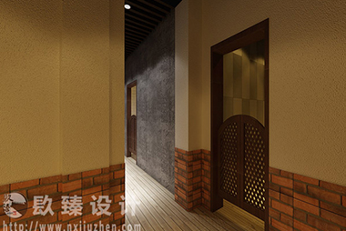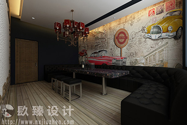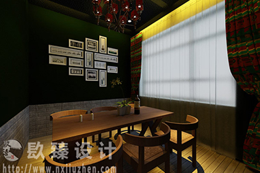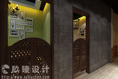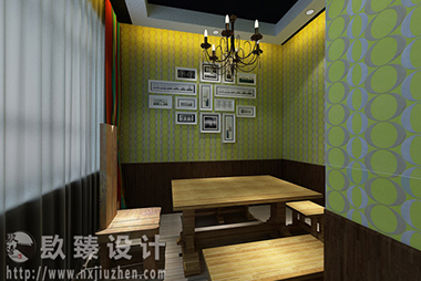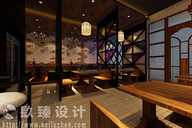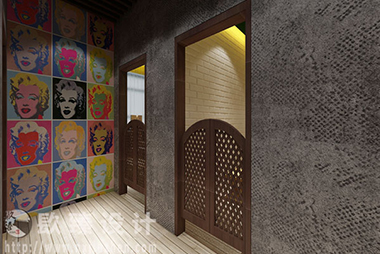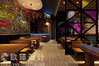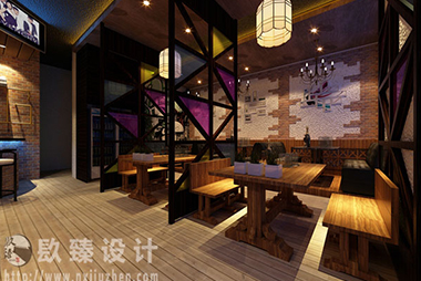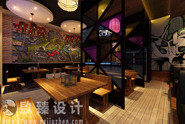 本案例的主要元素包括:木質元素、文化磚、藝術涂鴉、玻璃鏡、真石漆、壁紙等相互配合,給西北燒烤帶來全新而又充滿新穎的空間環(huán)境,并且呈現出完全不同于其他風格的主題感覺。而且在顧客用餐的位置上使用木質屏風隔斷,期間的框條夾層運用藍色與紫色玻璃鏡穿插,不但能讓空間具有隱私的感覺,還能在有色玻璃的渲染下,體現空間不一般的穿透能力。