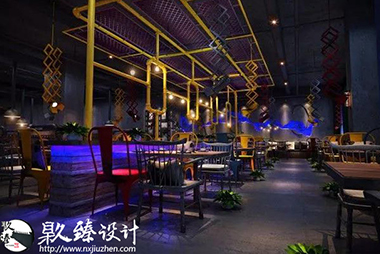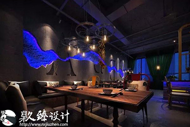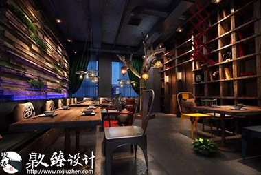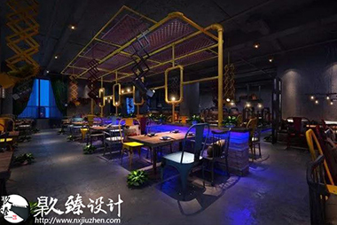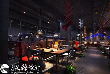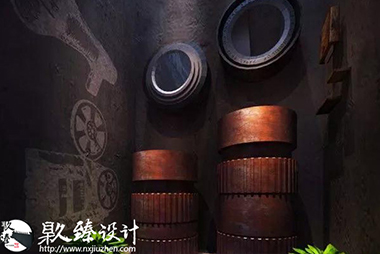 燒烤店其中的一角文化墻上的海苔是這片空間為數(shù)不多的綠植,為工業(yè)風(fēng)格的燒烤店帶來(lái)一抹綠意,小清新躍入眼簾,很好的緩解了視覺(jué)疲勞。清水混凝土墻與鋼的巧妙配合,鐵管與暖色燈光的色彩互動(dòng),削減了鋼鐵冷視覺(jué),柔和了空間美。原木的置物架上擺放著主人心愛(ài)的藏品,或許是幾個(gè)空酒瓶,或許是一卷麻布,又或者是一對(duì)仿真羚羊角,全憑主人心情與愛(ài)好,也許別人并不覺(jué)得有多么珍貴,但是在主人眼里他卻是無(wú)價(jià)之寶。將工業(yè)風(fēng)格與燒烤店完美的結(jié)合起來(lái),鋼鐵空間中也不乏柔情,設(shè)計(jì)的韻味就體現(xiàn)在此處。