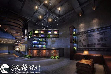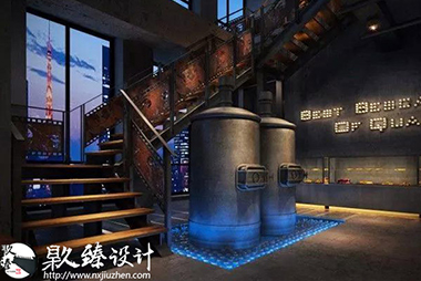 光看圖片暗色系的裝飾給人以不真實(shí)的感覺(jué),用清水混凝土、鋼、原木等自然物架構(gòu)打造內(nèi)部空間,局部綠植的點(diǎn)綴,冷暖色調(diào)的反差對(duì)比,給人以夢(mèng)幻的感覺(jué),并營(yíng)造出復(fù)古懷舊的浪漫氣氛,也更好地強(qiáng)調(diào)了設(shè)計(jì)的主題。粗糙的水泥抹平地面是粗狂的,然而藍(lán)紫色燈光又給了這片空間一種妖艷的視覺(jué)感受。