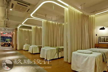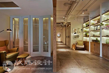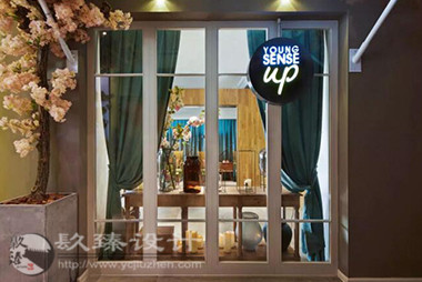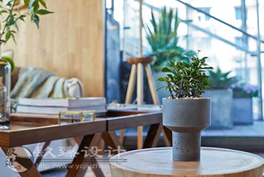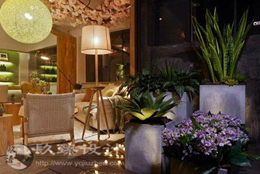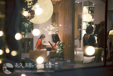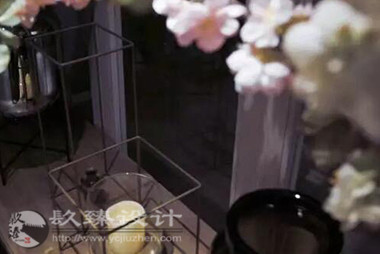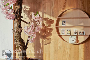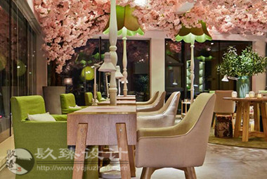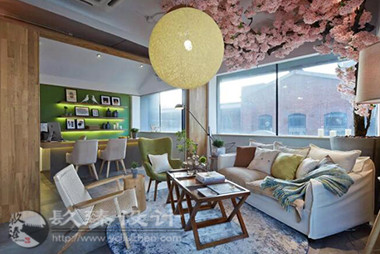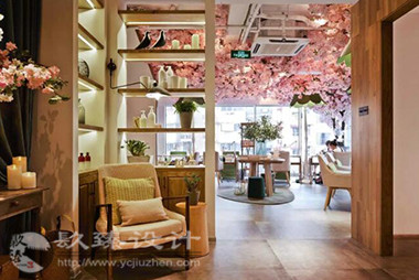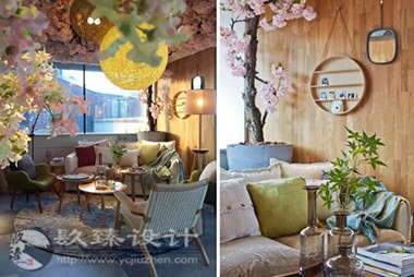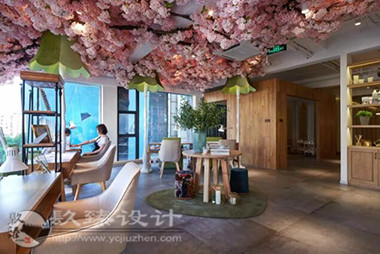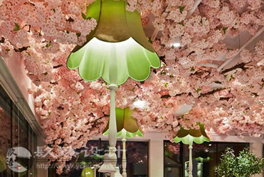 步出電梯就是櫻花樹(shù)下的櫥窗,隱約能看見(jiàn)窗內(nèi)的景象,推門(mén)而入是滿眼的櫻花,綠色落地?zé)舄q如撐傘在樹(shù)下賞櫻。櫻花樹(shù)枝伸到接待室的小屋頂上,透過(guò)天窗探出枝頭。