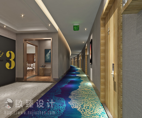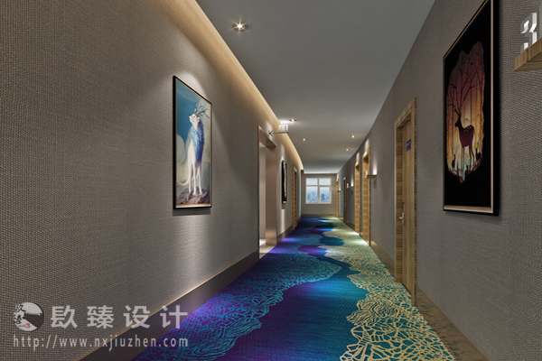 設(shè)計師在走廊采用藍色類似波浪的地毯再配以浪漫的裝飾畫,小編不想用多么華麗的辭藻來介紹,一看便知。