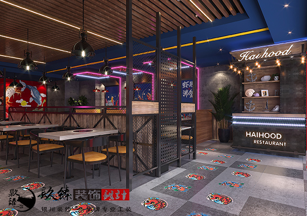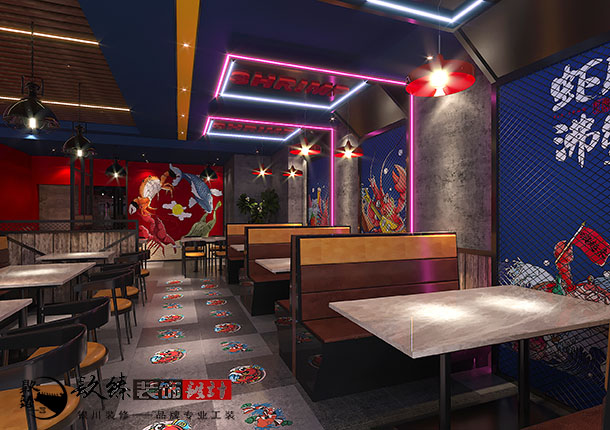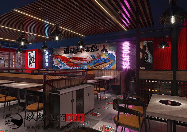 今天小編為大家重磅推薦銀川火鍋店裝修镹臻裝飾最新案例“大武口蝦哥魚妹紙包香鍋,這是一家專注于做“潮魚與美蝦“的特色餐飲,小編看到效果圖之后真的就被驚艷到了,色彩的沖擊使人看了之后內(nèi)心有一種蠢蠢欲動(dòng)的感覺,還沒被美食吸引,就首先被裝修吸引進(jìn)去了。本項(xiàng)目位置在大武口萬達(dá)廣場,面積為120平米,銀川裝修|火鍋店裝修設(shè)計(jì)整體風(fēng)格為工業(yè)風(fēng)格,現(xiàn)在的工業(yè)風(fēng)格餐廳越來越多,但是真正能把工業(yè)風(fēng)格的美以正確的搭配展示出來的餐廳卻沒有多少,工業(yè)風(fēng)格不只是按部就班的在空間內(nèi)植入一些金屬水管等材質(zhì)那么簡單,最終要的是如何將這些風(fēng)格元素以更專業(yè)更自然的設(shè)計(jì)手法植入當(dāng)中。而設(shè)計(jì)上魯玫,就將這一點(diǎn)做的很好,本案例只是稍微的融合了一部分的工業(yè)風(fēng)元素,比如吊頂,軟裝的桌椅配飾、金屬隔墻、工業(yè)吊燈等等。