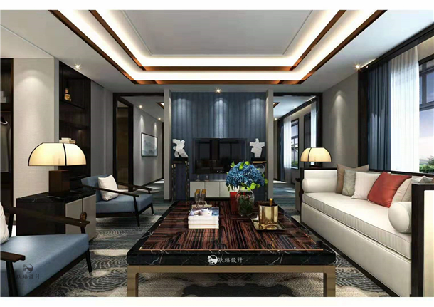 頂面多數(shù)使用新中式線條吊頂,低調(diào)中不失奢華,輕盈的金屬吊頂與檀木相結(jié)合,奢華與尊貴也彰顯了格調(diào)。衛(wèi)生間使用地磚,墻磚,金屬,玻璃等材質(zhì),會(huì)增加原本看起來比較小的空間,視覺上給人一種明亮的感覺,地毯用比較復(fù)古的深藍(lán)色系,和墻面的灰色搭配起來非常的有質(zhì)感,整體空間屬于比較冷色系的感覺,純靜,安逸感油然而生。