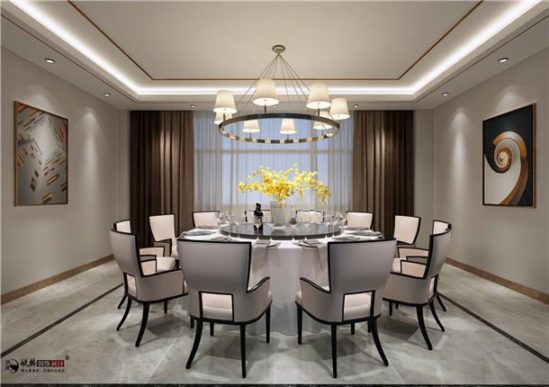 在基礎(chǔ)的硬裝設(shè)計(jì)中以木質(zhì)與石材相結(jié)合,采用現(xiàn)代的設(shè)計(jì)弧線的處理手法刻畫生出一個具備文化性、象征性、裝飾性的空間,空間中的藝術(shù)表達(dá)手法,除了在硬裝部分設(shè)計(jì)師使用現(xiàn)代手法,在軟裝配飾上還使用了一些藝術(shù)品烘托整體空間氛圍。追求設(shè)計(jì)極盡美感的豐盈,同時又獨(dú)具韻味,不失簡約精致的意境,是整體項(xiàng)目操作的思路。統(tǒng)一于都市主義風(fēng)尚中的,還有輕奢質(zhì)感的專心打磨,同時跳脫桎梏的前衛(wèi)、自由、張力。一樓大廳用餐區(qū)沒有過于搶眼的造型,也沒有濃墨重彩的渲染,而是以最經(jīng)典的現(xiàn)代設(shè)計(jì)筆觸,令金屬、皮革、石材等所有元素協(xié)調(diào)相處,并選用帶有高級感的中性色、溫馨舒適低調(diào)奢華,使整體空間具有很強(qiáng)的飽和度。