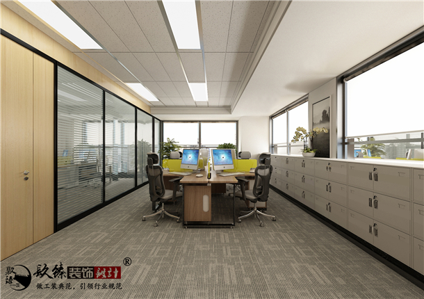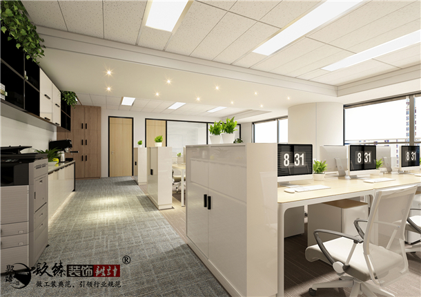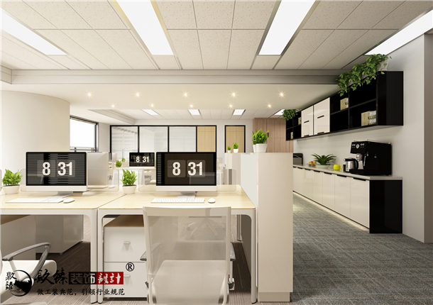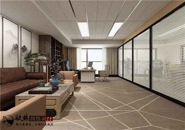 摒棄了一切繁文縟節(jié)的矯飾,一切盡在實(shí)用、明快而流暢的格局中;配合現(xiàn)代辦公環(huán)境的追求,設(shè)置實(shí)用與展示性相結(jié)合的半高書柜,旁倚商務(wù)型辦公桌,既陳設(shè)精雅、品味清亮、格調(diào)一致,又可于繁忙后賞窗外 風(fēng)光、待客會友;直接在原頂噴涂乳膠漆,凸顯了現(xiàn)代辦公的簡潔,利用不同的燈具劃分了辦公、會客區(qū)的燈光。