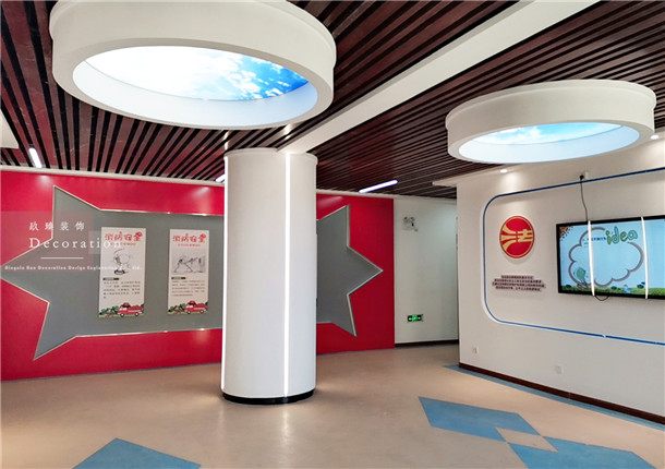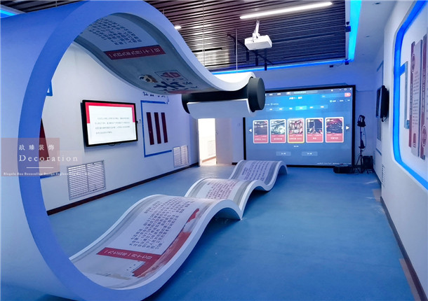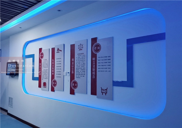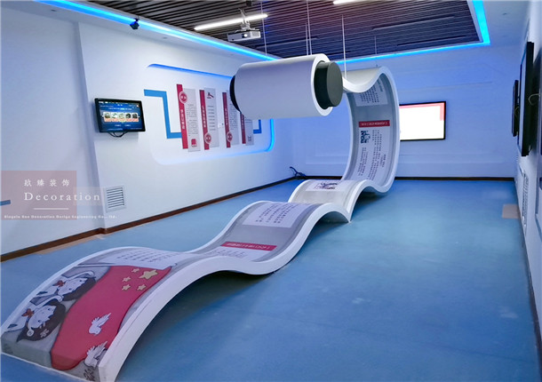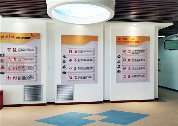首先學(xué)校走廊宣傳欄里寫有社會主義核心價值觀的宣傳文字,培養(yǎng)學(xué)生們的精神文明是非常有必要的。消防與法治教育是兒童教育中非常重要的部分之一,所以廣告欄內(nèi)也將這兩點(diǎn)納入其中以展廳類的形式描繪出一種簡潔的展現(xiàn)。 在展廳內(nèi)部最大的亮點(diǎn)是波浪造型的設(shè)計,在施工的時候是镹臻裝飾的工程總監(jiān)帶領(lǐng)專業(yè)技術(shù)工人對照施工圖細(xì)心所搭建而成,也是為了將效果更好的呈現(xiàn)。