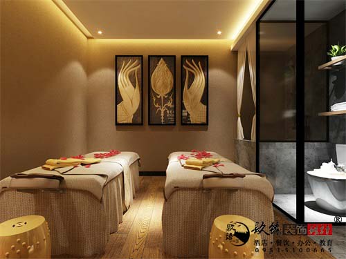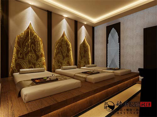 現(xiàn)代都市生活節(jié)奏越來(lái)越快,人們的生活壓力越來(lái)越大,養(yǎng)生保健也逐漸被人越來(lái)越重視。足療是一種很流行的保健形式,采用足底按摩的形式,讓人們疲倦的身體得到完全放松,對(duì)人的身體健康有著很大幫助。今天給大家?guī)?lái)的是泰式養(yǎng)生會(huì)所設(shè)計(jì)案例。在設(shè)計(jì)中,我們搜集了大量泰式傳統(tǒng)裝飾素材,并對(duì)這些素材進(jìn)行整合再創(chuàng)造,揉入現(xiàn)代設(shè)計(jì)理念的同時(shí)保持了原汁原味的泰國(guó)風(fēng)情,力求為客人打來(lái)最純粹的泰式感受。這種回歸自然、原滋原味的生活,近年來(lái)以其獨(dú)有的魅力和熱帶風(fēng)情也深受人們的喜愛。大廳以深色系的空間底色作為背景,與空間里跳脫的米黃色棕色等陳設(shè)品形成調(diào)和與均衡,地面以粗糲的顆粒感表達(dá)溫馨寧?kù)o的輕松氛圍。干凈的線條,柔熙的燈光,溫馨明亮,平衡節(jié)制。人行至此間,于舒適沙發(fā)小坐,品一茗清茶,悠閑自得。在注重傳統(tǒng)的同時(shí),也創(chuàng)造了優(yōu)雅的品味。足浴按摩室設(shè)計(jì)以現(xiàn)代之形續(xù)寫傳統(tǒng)意境,以時(shí)尚之物訴說(shuō)高雅品味,簡(jiǎn)單的線條搭配光影的變化,營(yíng)造有張力的色彩氛圍。整體選用純天然材質(zhì),通過(guò)對(duì)天然材質(zhì)的運(yùn)用使空間散發(fā)著濃厚的自然氣息。色彩斑斕的搭配,在燈光下閃耀著華麗熱情的光芒,制造出異彩紛呈的異域國(guó)度風(fēng)情。